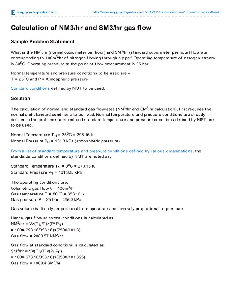 Calculation of NM3/hr and SM3/hr Gas Flow Sample Problem Statement PDF